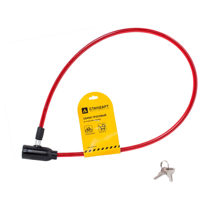 Замок навесной с тросом. Материал корпуса - сталь в пластиковом кожухе. Стальной трос- в пластиковой оплетке (8мм - диаметр, 800мм - длина). Цилиндровый механизм секрета, в комплекте 2 английских ключа.