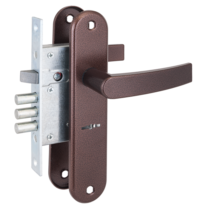 Замок врезной 6-сувальдный с защелкой и фалевыми ручками. Предназначен для установки в двери толщиной 40-50 мм. Замок универсальный, возможна установка как в правые, так и в левые двери.